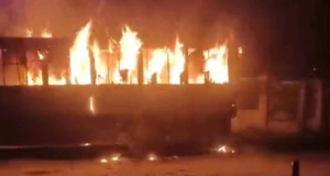 সাভারে বাসে আগুন, লাফিয়ে প্রাণে বাঁচলেন চালক