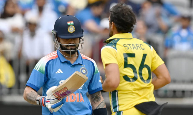 রোহিত আউট হওয়ার পর ব্যাটিংয়ে নামেন বিরাট কোহলি। তিনি ৮টি ডট বল খেলে স্টার্কের বলে কোপার কনোলির অসাধারণ ক্যাচের শিকার হন।