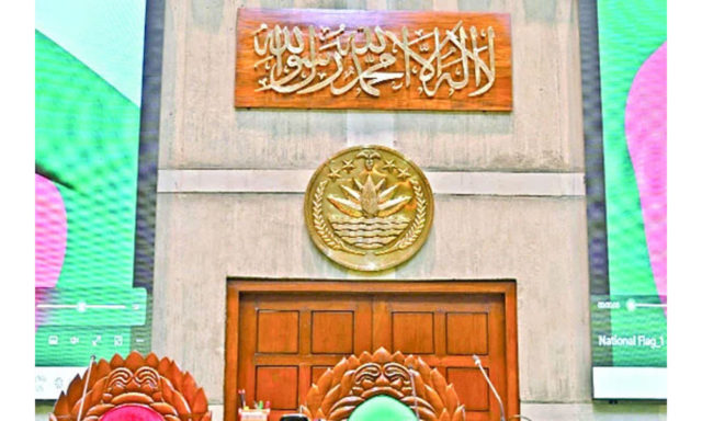 জাতীয় সংসদের অধিবেশন কক্ষে স্পিকারের চেয়ার বরাবর পেছনের উঁচু দেয়ালে পবিত্র কালেমা তাইয়্যিবা ‘লা ইলাহা ইল্লাল্লাহু মুহাম্মাদুর রাসুলুল্লাহ’ (সা.) লেখা আরবি ক্যালিগ্রাফি স্থাপন করা হয়েছে।